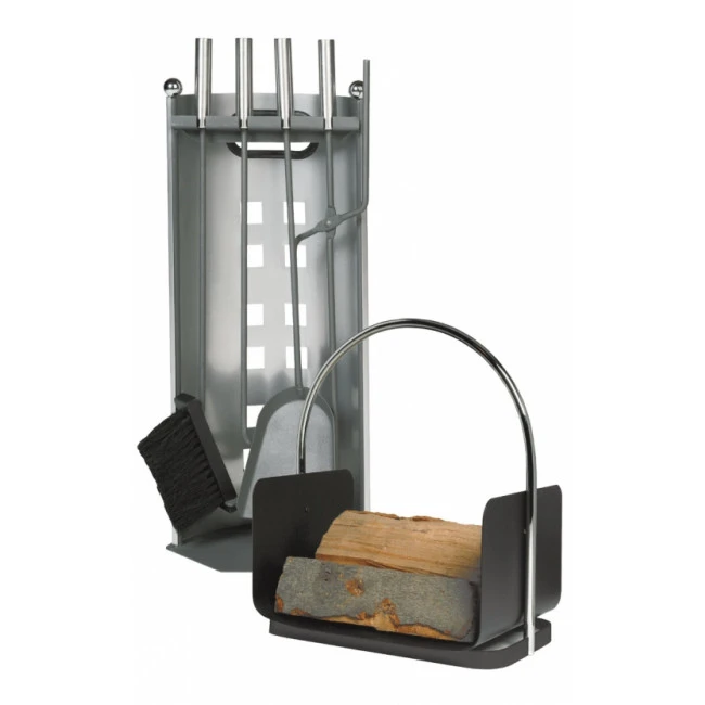 | Garniture de Cheminée et Panier à Bûches Garniture de Cheminée: Epoxy argent/anthracite avec poignées inox l/h/p : 23/58/15 cm