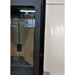 La peinture est écaillée par endroits sur le pourtour de la vitre intérieure et fait apparaître de petites tâches blanches.